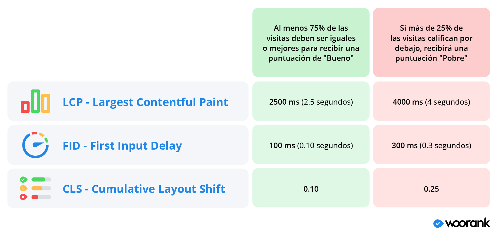 Google califica los Core Web Vitals (Largest Contentful Paint, First Input Delay y Cumulative Layout Shift) en un espectro de "bueno" a "deficiente" con métricas que se encuentran entre esos dos y reciben una calificación de "necesita mejorar".