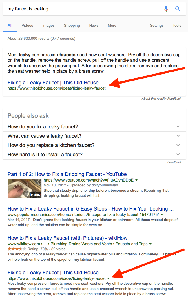 In this example of semantic content at work, this one page is in the top 10 results for four queries related to leaky faucets and appears in the coveted feature snippet in four of them.