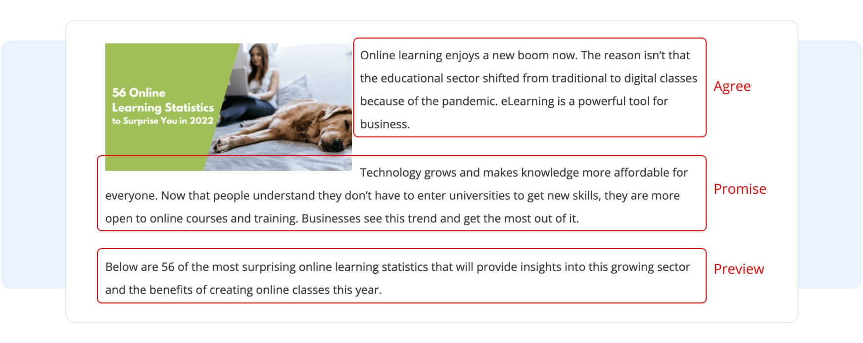 Both methods let SEO writers keep their introductions concise, straightforward, and appealing to the reader. Both methods are quick and easy to read and make it clear to the reader if the content is worth finishing.