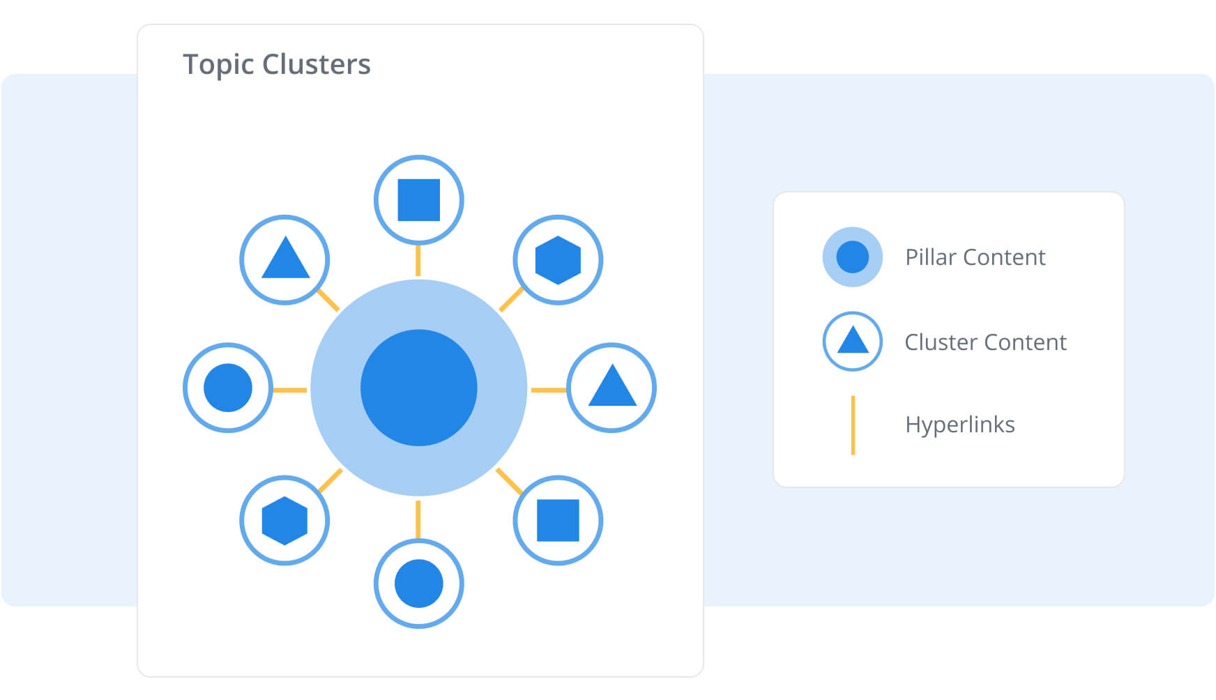A topic cluster is made up of a pillar content page and several content pieces related to it. The pillar page targets keywords with a high search volume, with the other content pages targeting specific keywords.