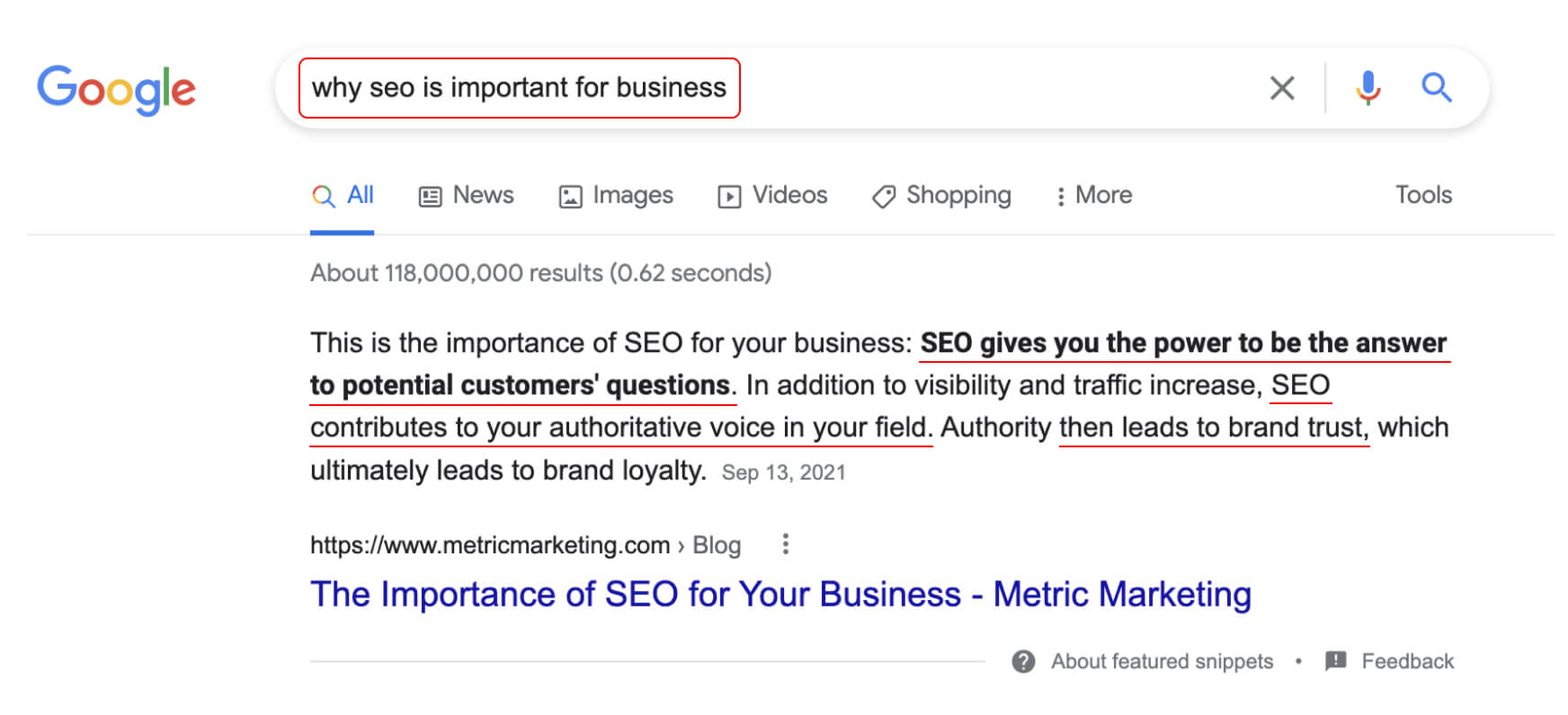 There are considerable SEO benefits when your content is featured in a Google Snippet, for instance, a boost in your site’s credibility, an increase in traffic, and more visibility for your site and your brand.