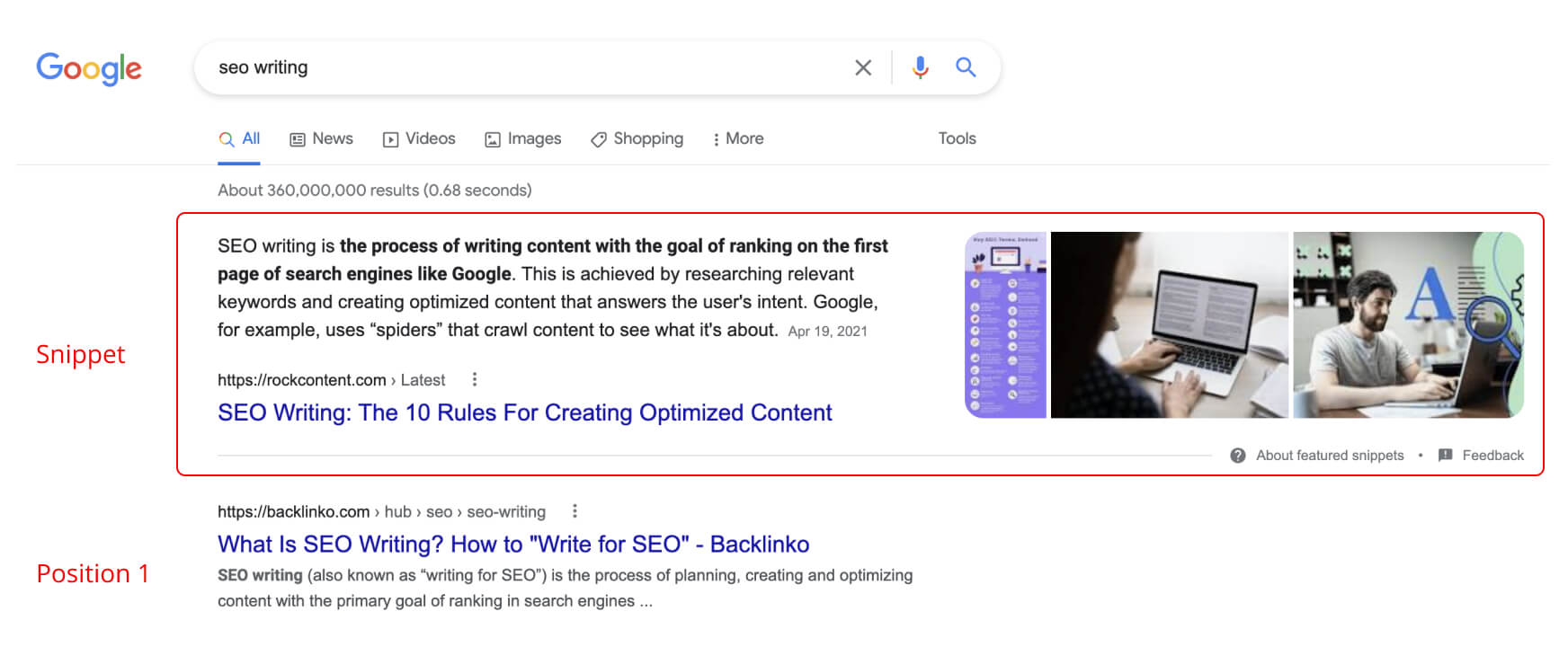 Google's Featured Snippets, aka Position 0, are the SERP results that appear at the very top of the page, answering search queries without forcing users to actually click on a website. Snippets are usually depicted as lists, definitions, simple bullet points, images, and sometimes video clips.