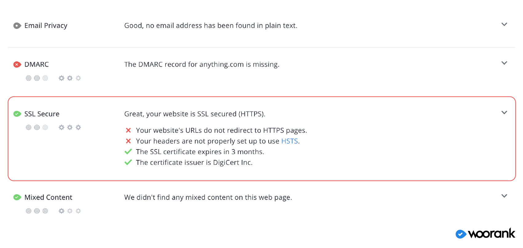 There are always invisible issues on a page, security being one of the major things WooRank’s Assistant identifies. HSTS, or HTTP Strict-Transport-Security response header, tells browsers whether your website should be accessed using HTTPS or HTTP. Hosting over HTTPS ensures the connection in between your site and visitors remains secure and encrypted. To host over HTTPS, you need to install an SSL certificate for your website’s server. Though SSL certificates can be issued by several entities including GoDaddy, Let’s Encrypt is a free open certificate authority backed by the nonprofit Internet Security Research Group (ISRG). Once your SSL certificate expires (after 24 months), your site may be unreachable–essentially a dead end for your site’s traffic. Google also announced in 2014 that a HTTPS website will receive an extra boost in their ranking over HTTP websites. It’s important customers feel safe if they are spending a long time on your website, sharing sensitive information like their credit card numbers or home address. If there are in fact security issues, it makes your website vulnerable to data breaches. This can damage a company’s image long-term when customers lose trust in your website’s security. By looking for security and technical issues early, you have a decent time buffer to bring in help from the IT department to fix errors that could take days to resolve.