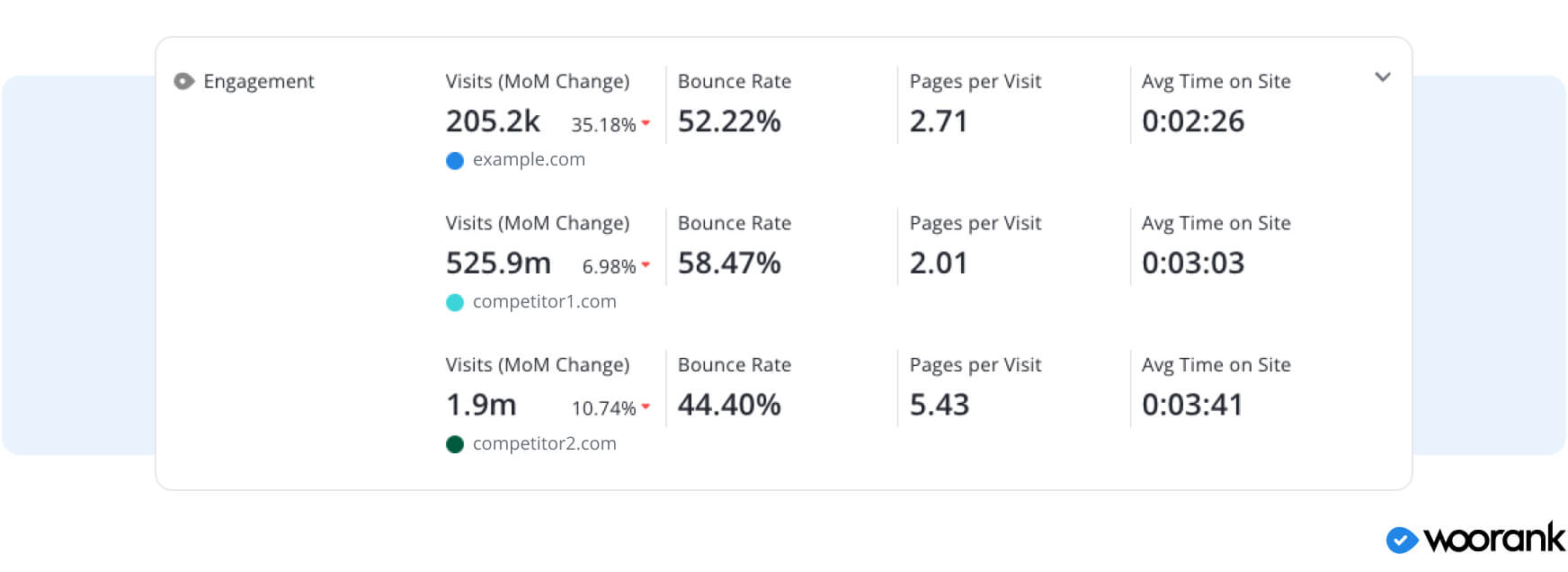 WooRank reports now include additional data, offering four new Traffic criteria to collect website data and measure performance. WooRank users that audit their website can now view Top Countries, Top Engagement Tips, Monthly Visit Tips, and Marketing Distribution Channels within their report.