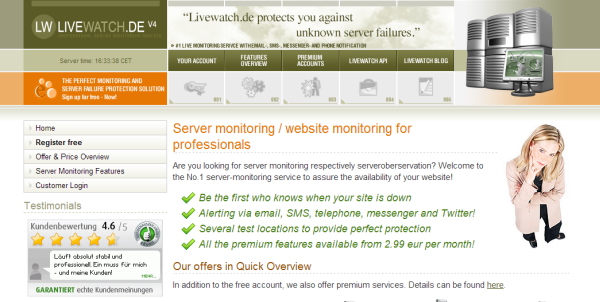 This free uptime monitoring service gives you downtime alerts via email, SMS, telephone, messenger and Twitter. It gives you a graphical analysis of the report and a PDF protocol that is created for 30 days after each failure in the report. The premium plan offers additional features.