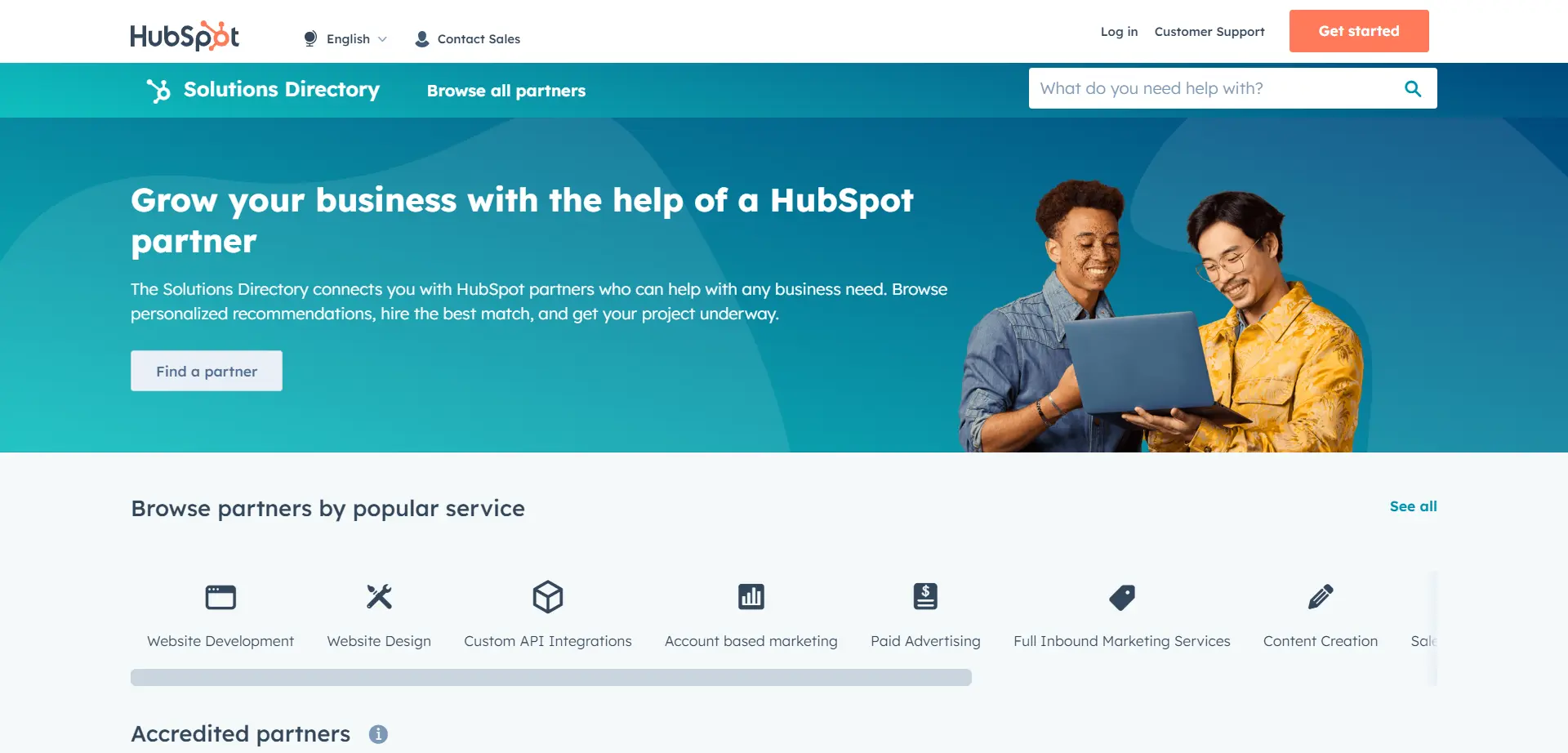 What about the words you use? A compelling landing page headline should promise a solution to a real problem that resonates with your audience. A classic example is the Hubspot. The screenshot provided shows that the company successfully implements this approach ("Grow your business with the help of a HubSpot partner").