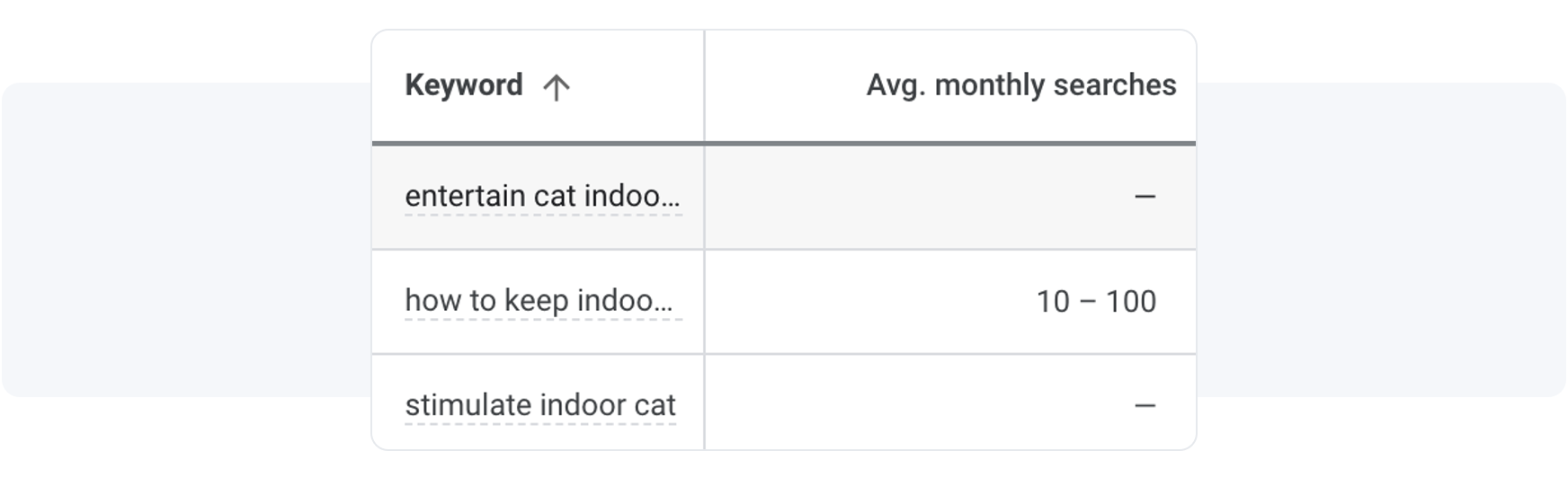 Let’s pick one of our topics from above to try to find an SEO keyword: How to ensure your indoor cat is fully stimulated and entertained.