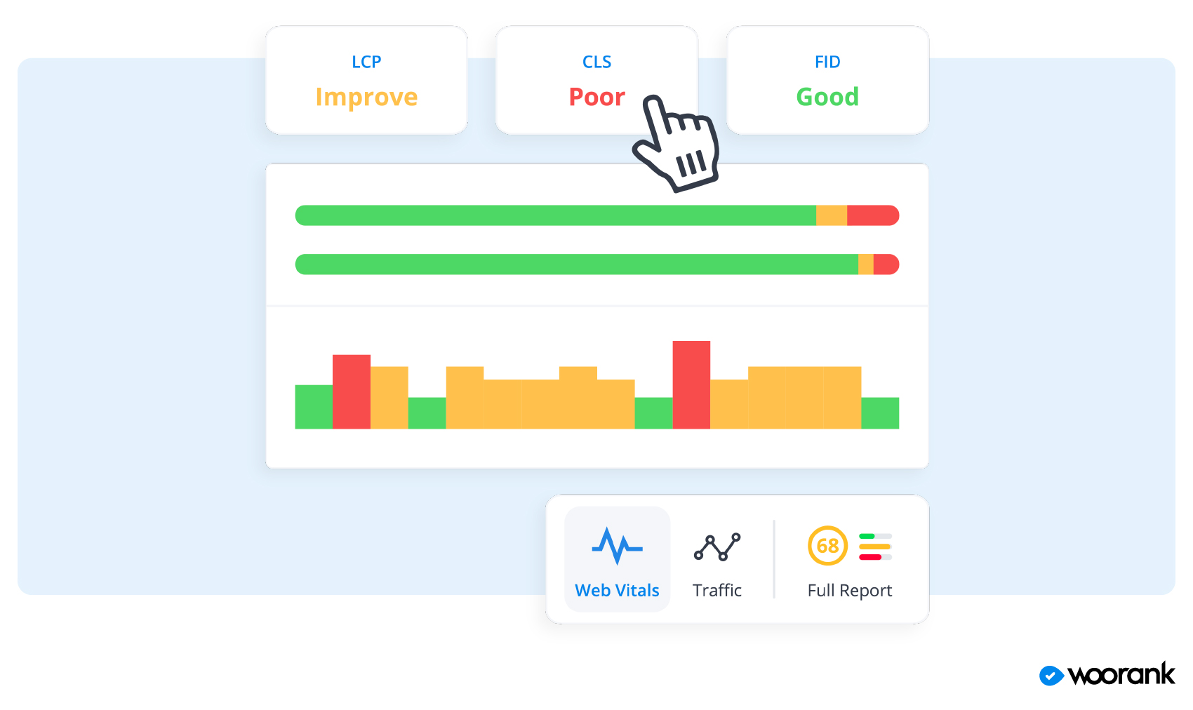 WooRank users that specifically implement the Assistant will have access to real-time Core Web Vital data for each web page on their sites. Core Web Vitals (CWVs) are the essential metrics that Google uses to determine how positive or negative your site experience is for your visitors. Those metrics include: