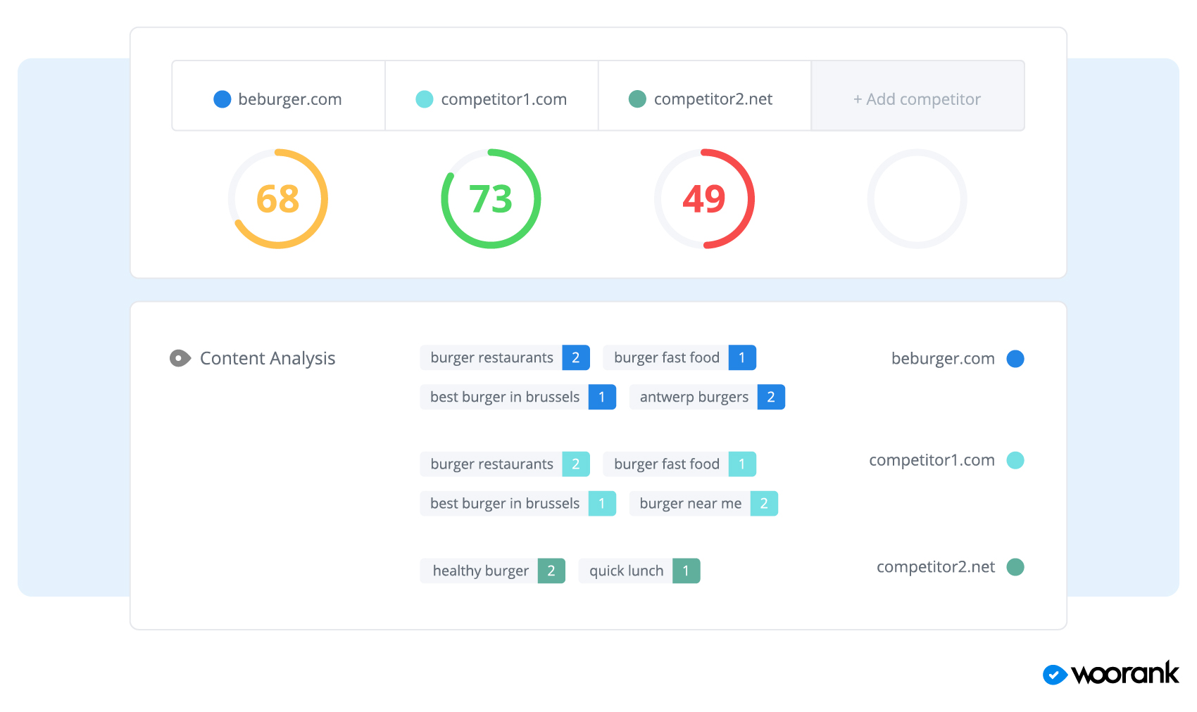 No matter the type of site, it’s always important to know what the competition is up to. The WooRank Assistant can keep an eye on your top competitors, and score them as well, so site owners can instantly see how their sites compare. If the WooRank Assistant highlights the fact that a competitor has a higher backlink score, then you know to prioritize improving that metric. You can enter specific competitors for the Assistant to keep an eye on, so you know exactly who’s the biggest threat to your rank.