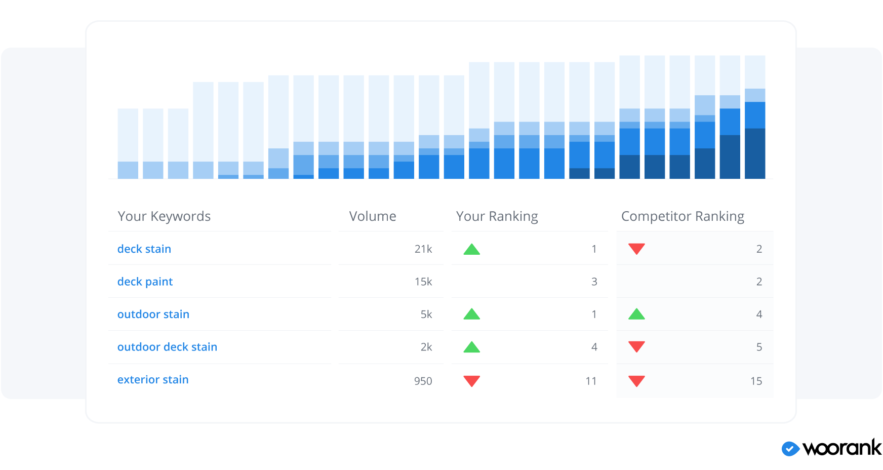 A workaround can be to include variants of the main keyword. So if the keyword is "deck stain," you can use other phrases such as "deck paint," "outdoor stain," "outdoor deck stain," and so on. Tools like WooRank make it easy to search for keywords, check search volume, and do competitor analysis easily.
