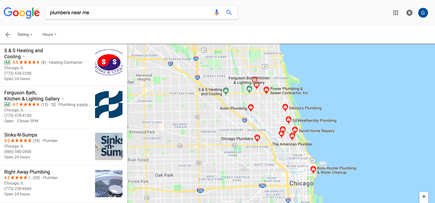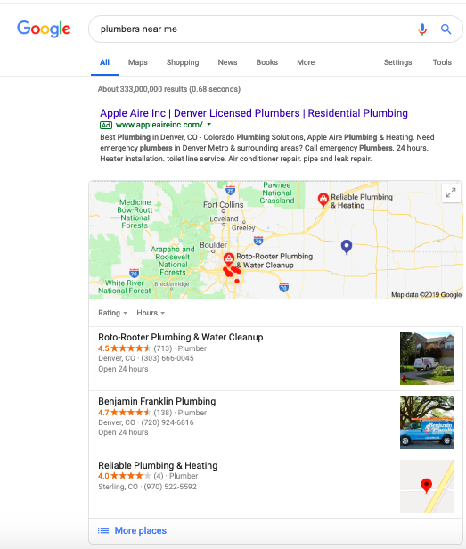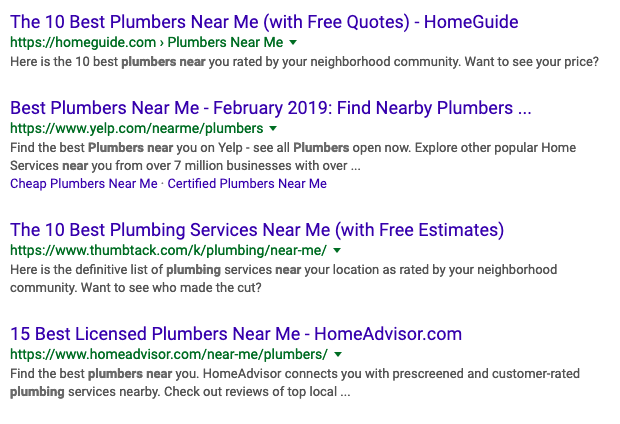 As we covered above, this difference is visible in the queries people use ("plumbers near me" vs. “how to fix a sink”). The difference is also easily seen in the search results themselves. Here are the results for “plumbers near me”: