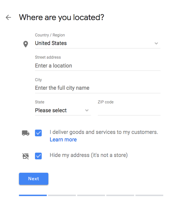 - If you don’t want people to visit your physical location (like if it’s a dispatch center, for example), make sure you’ve checked the "Hide my address" box. If you go to your customers (instead of having them visit your store), check the box for “I deliver goods and services to my customers”. Click “Next” to set your delivery area or radius.