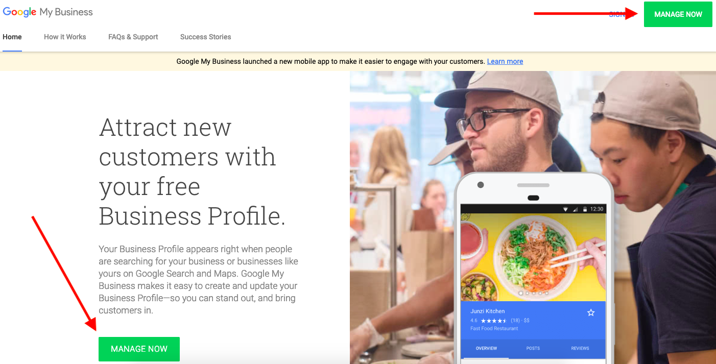- Go to the Google My Business website and click one of the 2 Manage Now buttons.