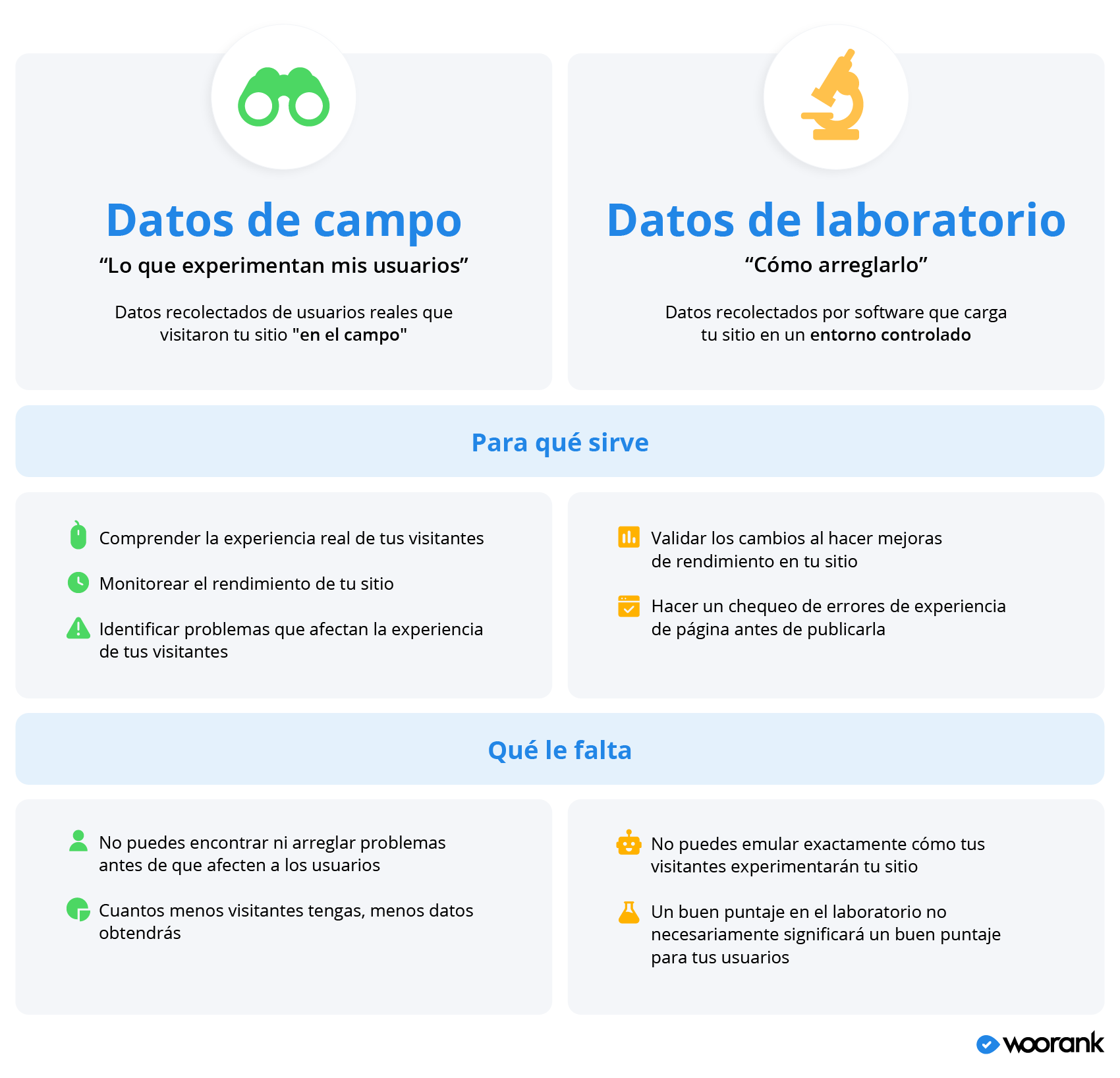 Ambos tipos de datos son importantes para los propietarios de sitios web, por lo necesitan herramientas de laboratorio y de campo para asegurarse de que su sitio web obtenga una buena puntuación entre los usuarios y Google.