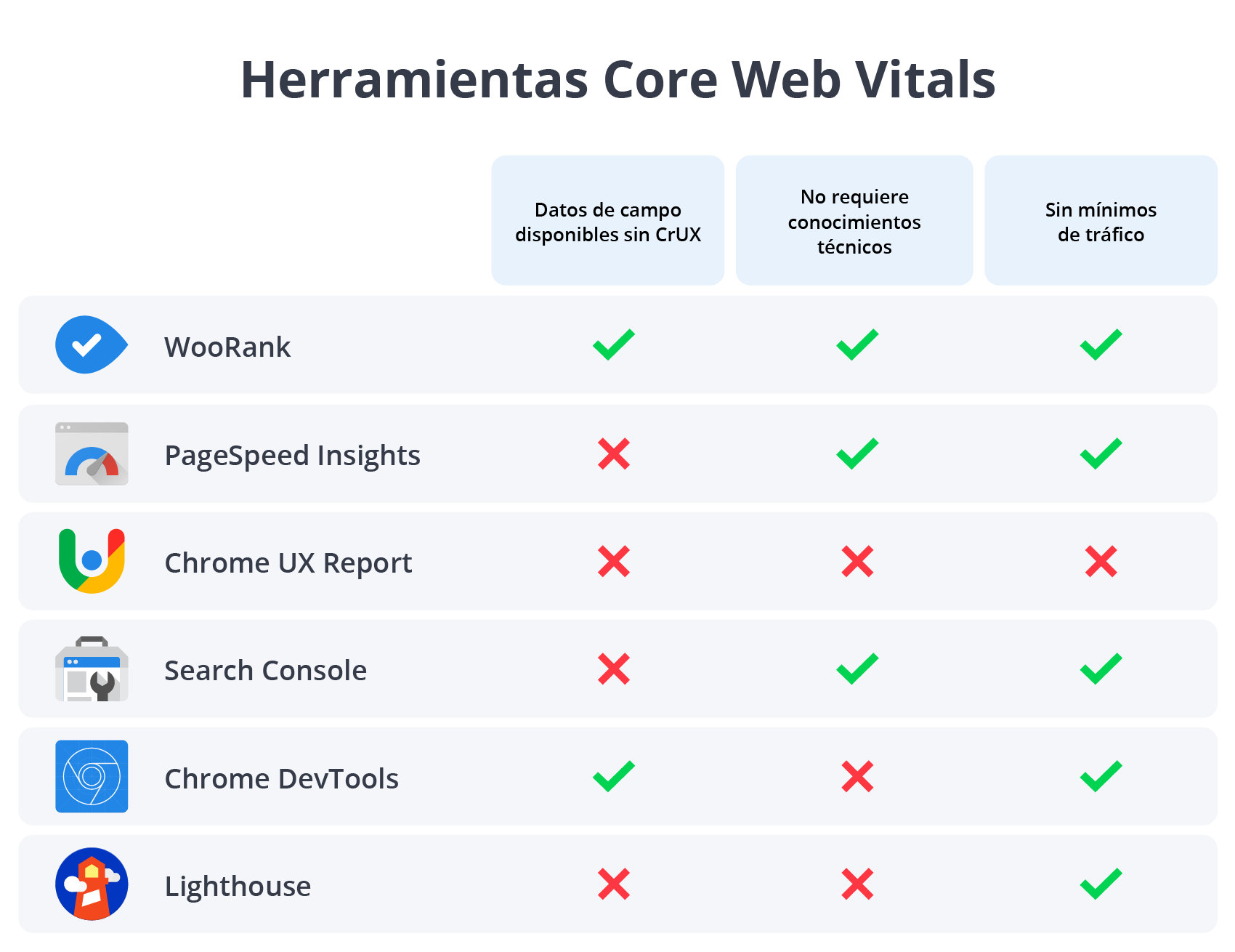 La misión de WooRank es hacer que sea rápido, fácil y directo para cualquiera que busque mejorar su sitio web y su marketing. Hemos adoptado ese enfoque para medir los datos de Core Web Vitals.
