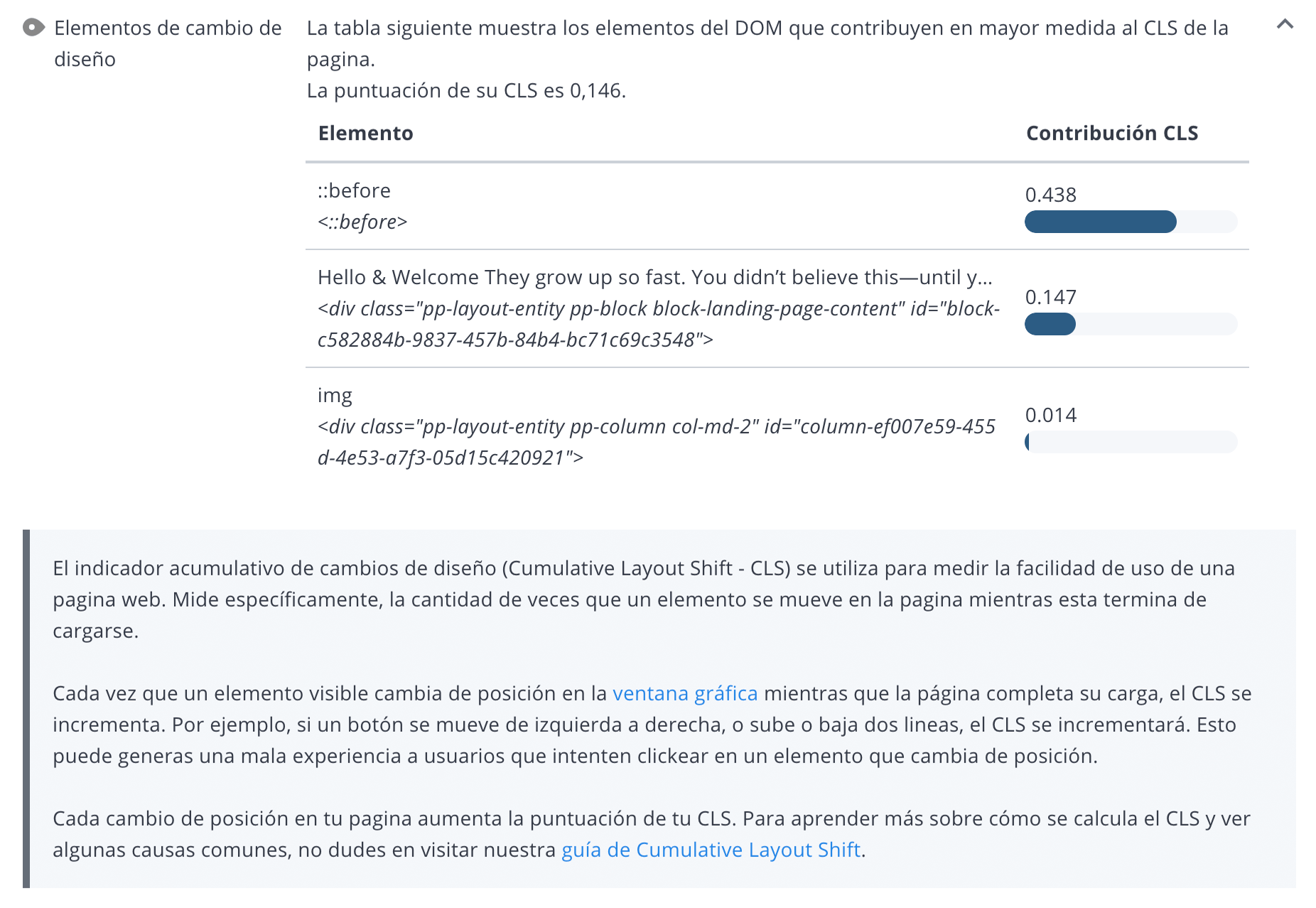 Dentro de la sección de usabilidad para la revisión de una página, encontrarás qué elementos de la página están causando problemas para las métricas de CWV, lo que facilita que tú o tu equipo de desarrollo solucionen los problemas y mejoren el rendimiento.
