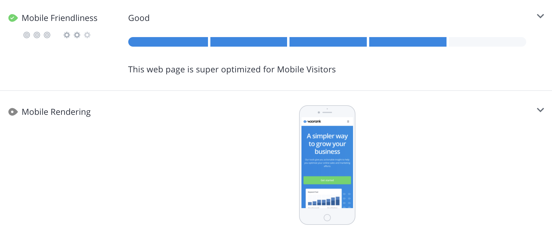 Mobile friendliness: In short, mobile friendliness is a measure of how well a site performs when someone tries to visit and use the site with a mobile device. Mobile friendly pages are able to shrink down to fit on any device’s screen while still allowing people to navigate around the page to achieve their goals. They also prioritize the mobile user experience through responsive design, simple and easy navigation and fast page speeds.
