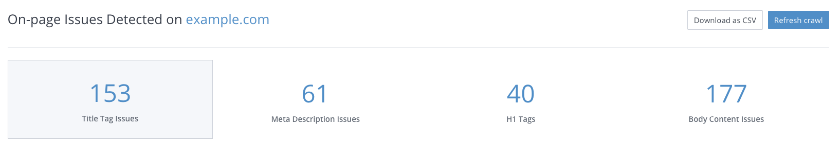 Vous savez probablement si votre site présente l'un des exemples les plus évidents de contenu dupliqué : le plagiat. Mais vous pouvez aussi créer des pages dupliquées sans le savoir, par accident. Heureusement, Site Crawl vous permet d'identifier ces pages dupliquées, ainsi que les pages non dupliquées pouvant présenter une forte ressemblance.