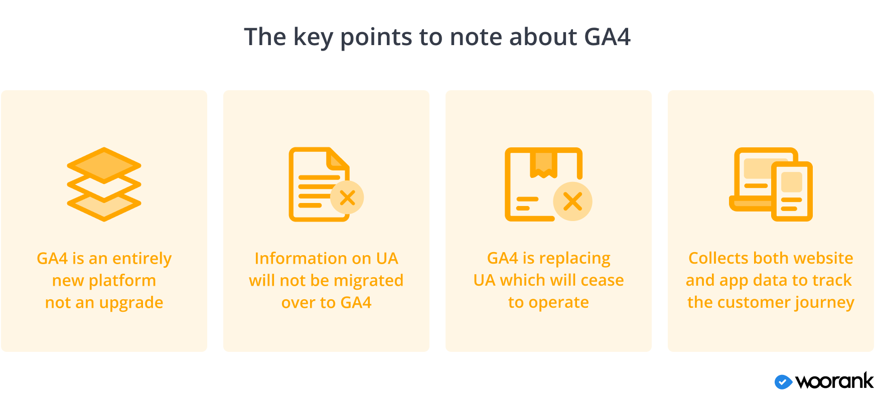- GA4 is an entirely new platform, using a completely different data model, it’s not an upgrade