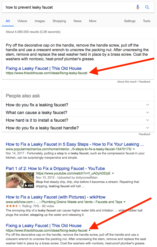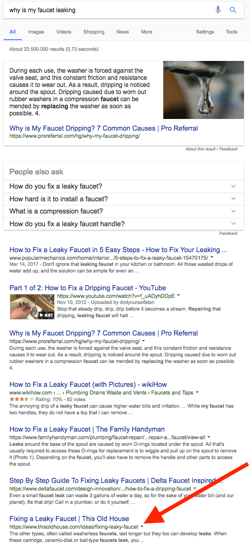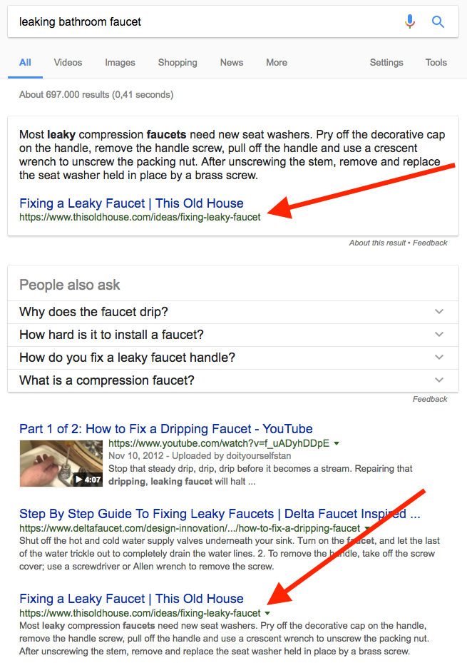In this example of semantic content at work, this one page is in the top 10 results for four queries related to leaky faucets and appears in the coveted feature snippet in four of them.