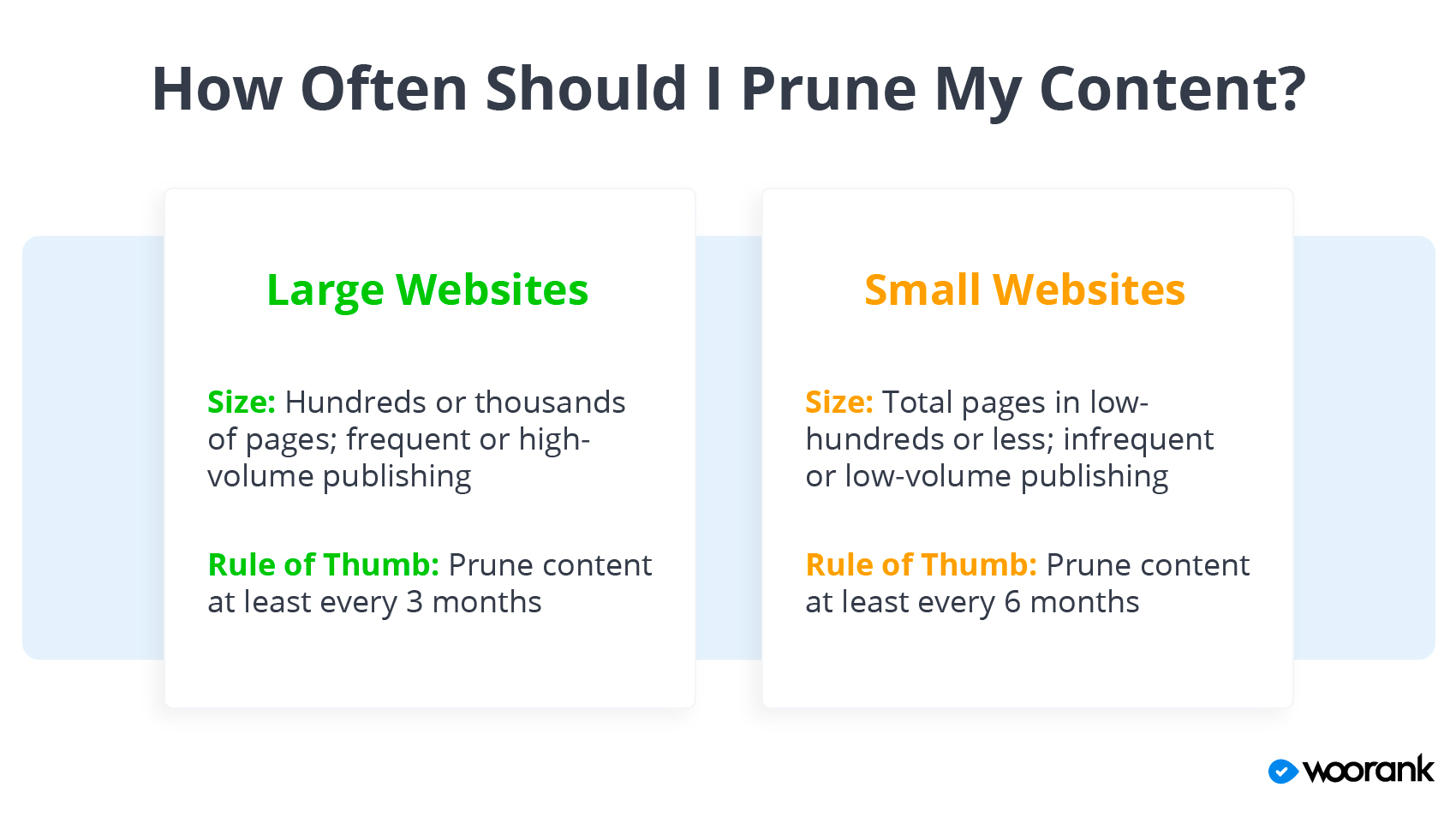 Content pruning isn’t a one-fix wonder. For all businesses (large and small), it’s a process that needs to be revisited continuously. The amount of pruning needed depends on the size of your business. Generally, it is recommended that large websites review their content every three months. Not only does this keep your content library looking fresh, but it also helps marketing teams monitor content performance over time, and make necessary changes accordingly.