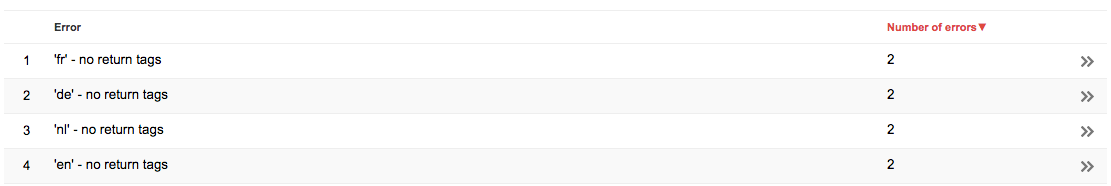 This is another normal problem when adding hreflang tags to your pages. Every annotation must have a corresponding link pointing back to it from the linked page. If you’ve got pages in English and Spanish, those pages must both link back to each other: The English page has to have a link to the Spanish page and the Spanish page must have a link to the English page. Missing these tags causes what’s called a ‘return tag error.’