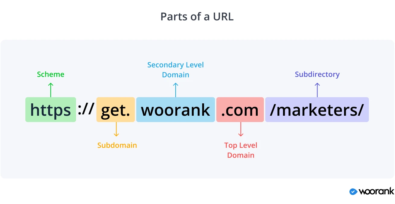 Technically, a URL has five parts – the scheme, subdomain, second-level domain, top-level domain, and the subdirectory. How these parts are structured and relate to each other is significant for your site's SEO and user experience (UX).