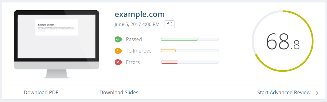 - SEO Score: When you first conduct your audit you will be given an SEO score. This can either be given as domain authority, page authority or as a score between 0-100. With Woorank you can easily see your progress by looking at this score which changes as you optimize your website.